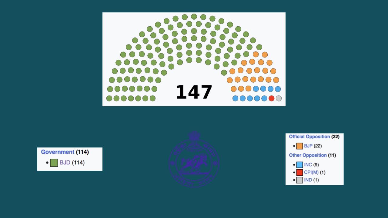 The Odisha state has a unicameral legislature.[93] The Odisha Legislative Assembly consists of 147 elected members,[91] and special office bearers such as the Speaker and Deputy Speaker, who are elected by the members. Assembly meetings are presided over by the Speaker, or by the Deputy Speaker in the Speaker’s absence.[94] Executive authority is vested in the Council of Ministers headed by the Chief Minister, although the titular head of government is the Governor of Odisha. The governor is appointed by the President of India. The leader of the party or coalition with a majority in the Legislative Assembly is appointed as the Chief Minister by the governor, and the Council of Ministers are appointed by the governor on the advice of the Chief Minister. The Council of Ministers reports to the Legislative Assembly.[95] The 147 elected representatives are called Members of the Legislative Assembly, or MLAs. One MLA may be nominated from the Anglo-Indian community by the governor.[96] The term of the office is for five years, unless the Assembly is dissolved prior to the completion of the term.[94]